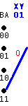 THIS -------------> NEXT STATE STATE BA -C--> CBA=(XY) next BA ------------------------- 00 -0--> 000=(00) ===> 00 00 -1--> 100=(11) ===> 10 ------------------------- 01 -0--> 001=(11) ===> 00 01 -1--> 101=(00) ===> 10 ------------------------- 10 -0--> 010=(10) ===> 01 10 -1--> 110=(01) ===> 11 ------------------------- 11 -0--> 011=(01) ===> 01 11 -1--> 111=(10) ===> 11 ------------------------- |