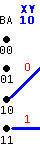 THIS -------------> NEXT STATE STATE BA -C--> CBA=(XY) next BA ------------------------- 00 -0--> 000=(00) ===> 00 00 -1--> 100=(11) ===> 10 ------------------------- 01 -0--> 001=(11) ===> 00 01 -1--> 101=(00) ===> 10 ------------------------- 10 -0--> 010=(10) ===> 01 10 -1--> 110=(01) ===> 11 ------------------------- 11 -0--> 011=(01) ===> 01 11 -1--> 111=(10) ===> 11 ------------------------- |